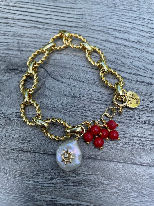 7” chain and pearl/coral bracelets with dangling charms 14k gold filled, freshwater pearls and coral stones and evil eye pendants