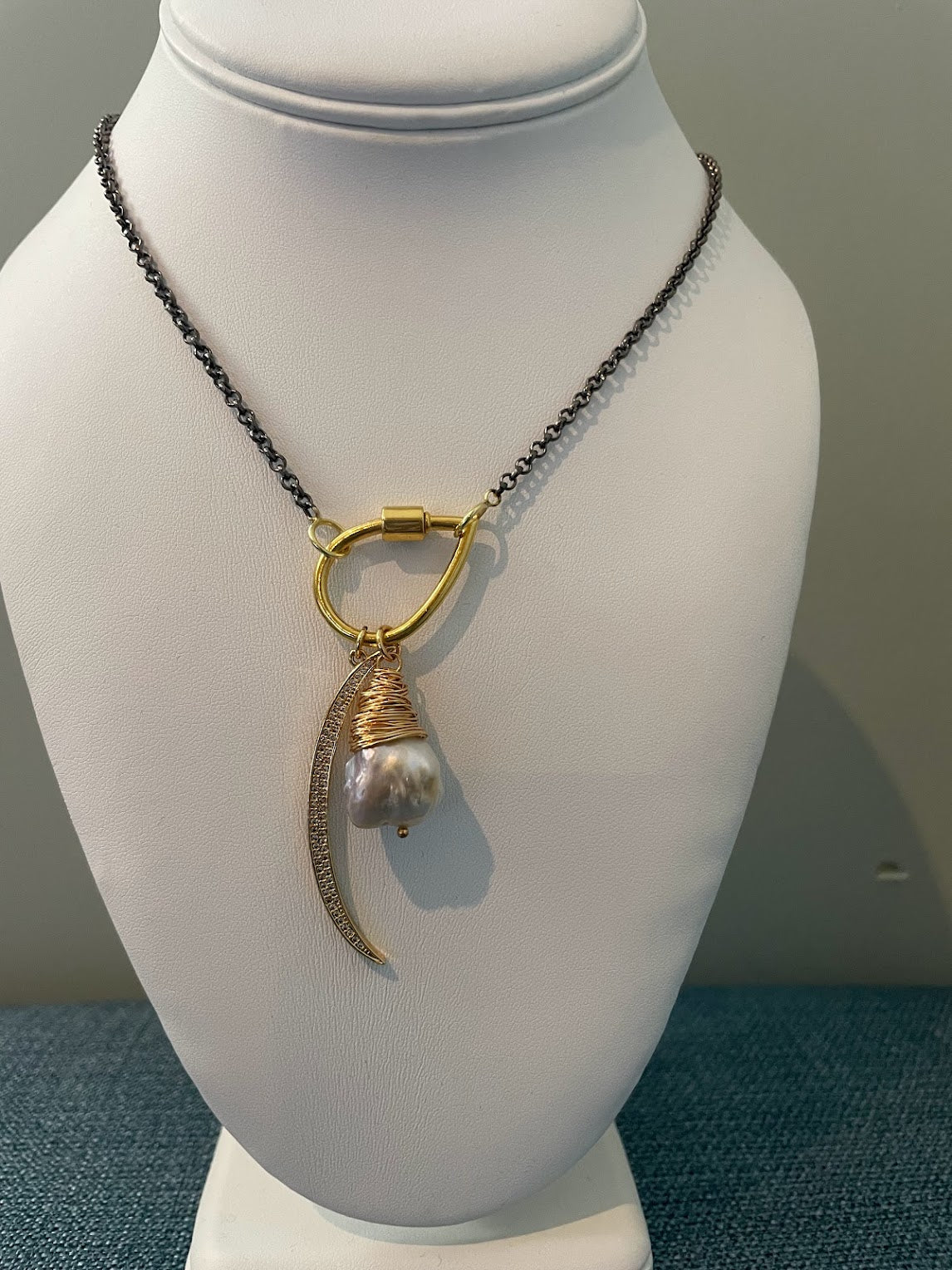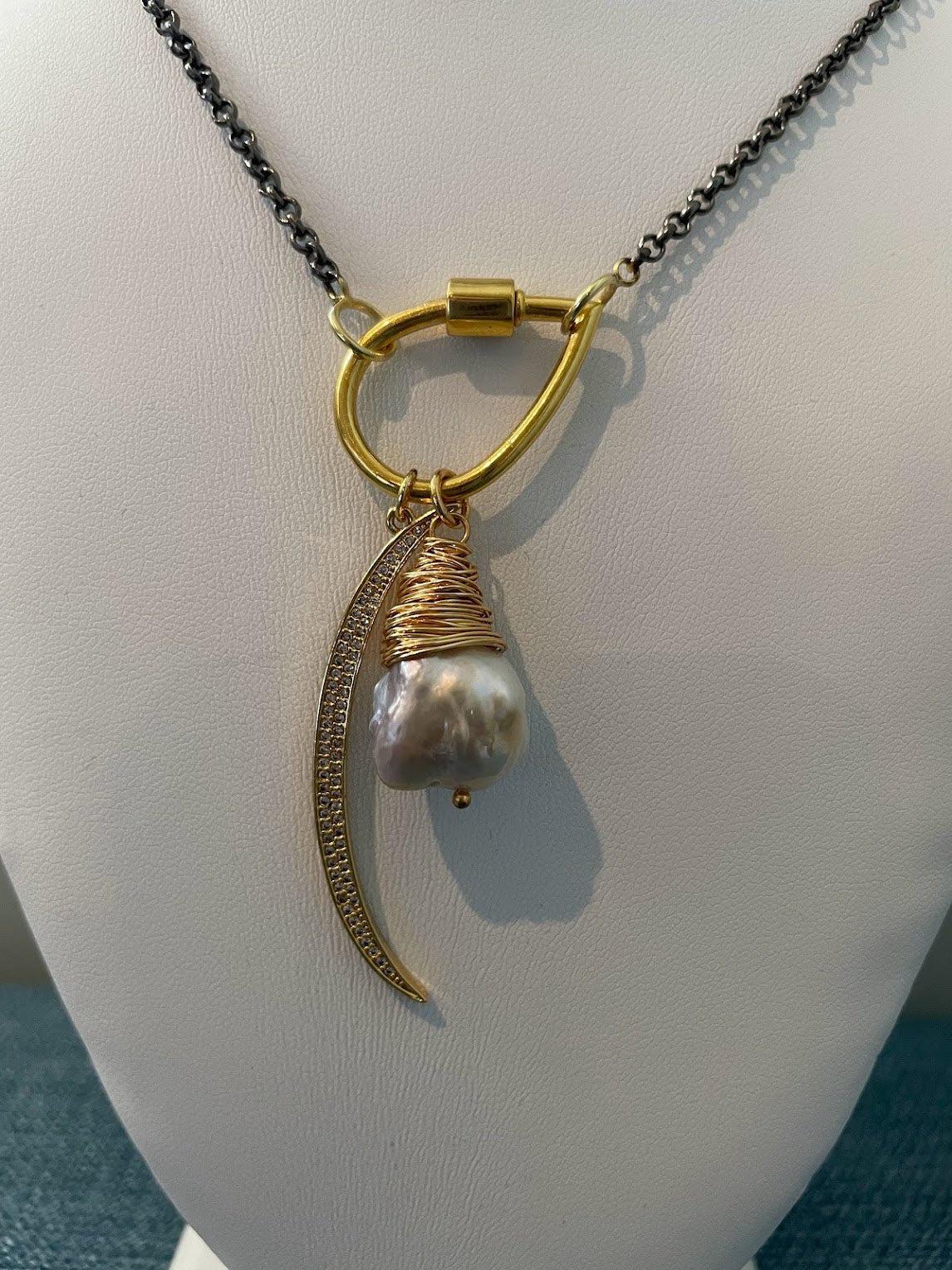 18" black rhodium chain with 18k gold filled charm holder and freshwater pear charm and crescent rhinestone charm