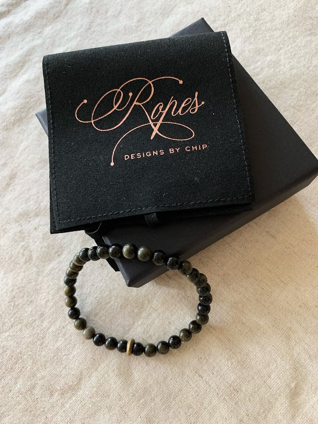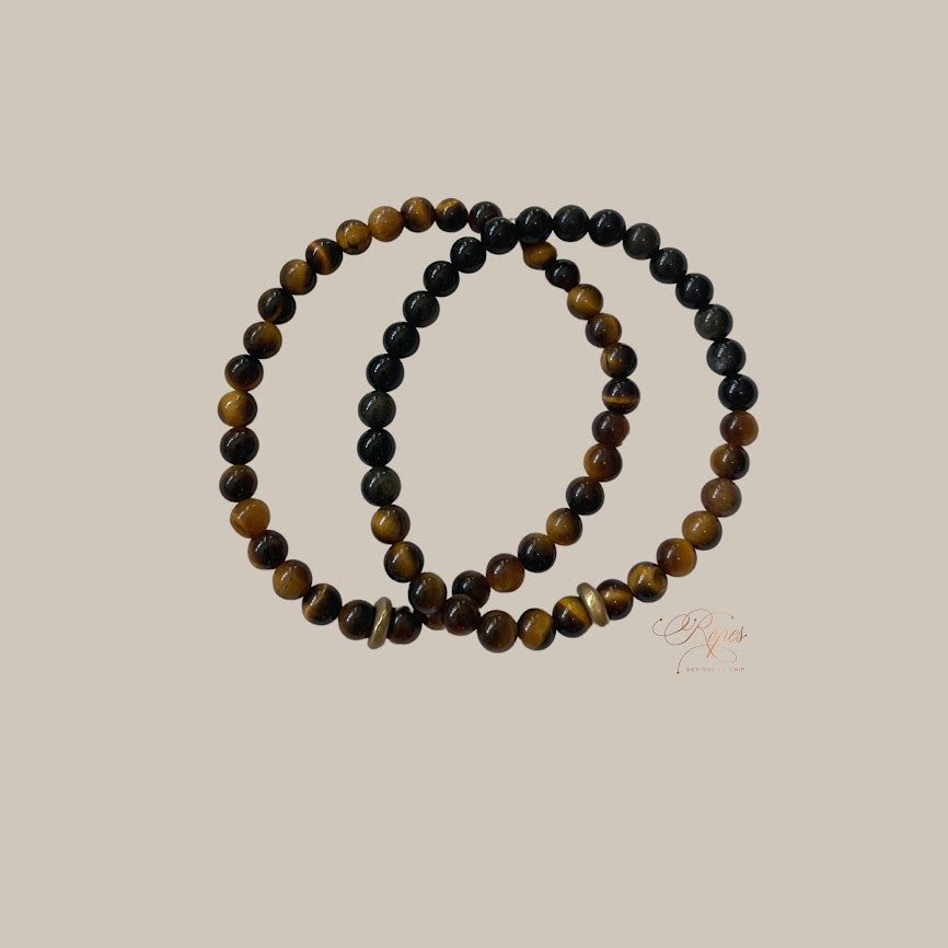 8 inch Tiger eye gem stretch bracelet with brass spacer with black obsidian gems